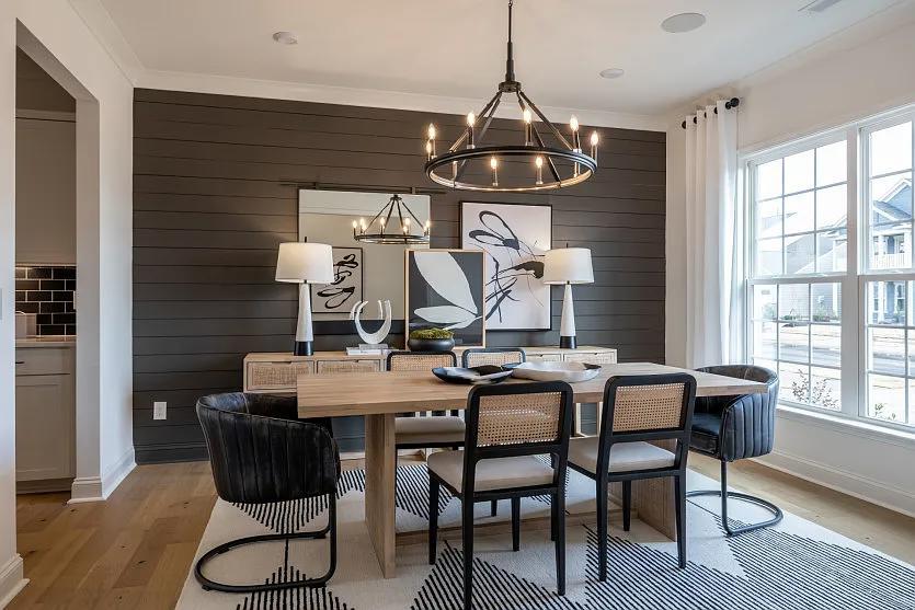 Welcome to a stunning Riverton model condo! This modern home is designed to impress with its contemporary style while offering ample space for comfortable living. Step inside to find a spacious entryway featuring elegant hardwood flooring and bright white walls, welcoming you into your new home. The inviting living room boasts a light-colored sectional sofa draped with a cozy throw blanket, perfect for relaxation. A sleek black fireplace, set against a stylish brick wall, adds warmth, while the mounted flat-screen TV provides entertainment options for movie nights. Large windows fill the room with natural light, creating an airy atmosphere.