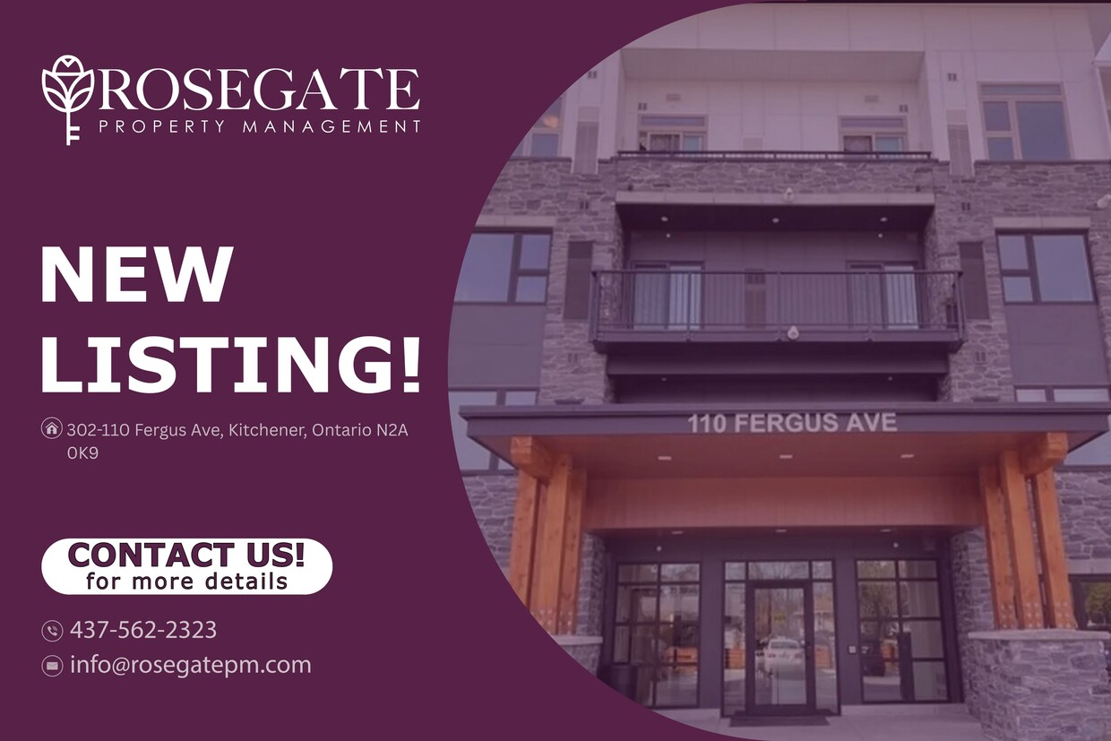 Corner 1+Den Condo with Private Balcony & Parking in Kitchener Welcome to Unit 302 at 110 Fergus Ave, Kitchener — a bright corner-unit condo offering approximately 792 sq. ft. of well-designed living space. Featuring 1 bedroom plus a den and 1 bathroom, this home is ideal for professionals or couples seeking comfort, functionality, and the benefits of a professionally managed Ontario rental property.The open-concept layout is enhanced by large windows that fill the unit with natural light, while the private balcony provides a perfect spot to relax and unwind. The versatile den is ideal for a home office, guest area, or additional storage, making the space adaptable to modern living.Additional highlights include one dedicated parking space, adding everyday convenience. As a corner unit, the condo offers added privacy and a quieter living experience compared to interior units.Professionally managed by Rosegate Property Management, a trusted Ontario rental property management company, this Kitchener condo for rent is conveniently located near transit, shopping, parks, and everyday amenities. A bright, modern condo with excellent features — schedule your viewing today.