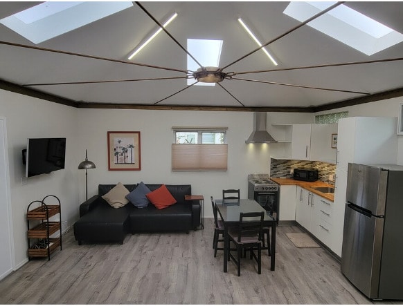 A light-filled, newly renovated private studio located in the heart of Venice. This bright and spacious unit is located within walking distance of local restaurants, coffee shops, art galleries, and all the trendy spots in the area, as well as the beach. The studio features high ceilings, skylights, and double doors that lead to the garden, where you'll find a sitting area with table and chairs. The full kitchen is equipped with all the essentials, including a fridge, stove, microwave, and toaster. Towels and linens are not provided. You'll also find a comfortable couch, flat-screen TV with Roku, and a dining table with chairs. The unit is temperature controlled with a "minisplit" system that both heats and cools the space. There is a shared laundry room just behind the studio as well as beach shower. Utilities including electricity, gas, water, and high-speed internet are included in the rent. Access to the studio is through a side gate with a keypad lock, and there is plenty of street parking available. We have two well-behaved dogs that enjoy the shared yard when we are around. The studio has a small gated porch to keep the pets out. Venice is known for its canals, inspired by those in Italy, and the iconic boardwalk, home to Muscle Beach, street performers, vendors, bars, and restaurants. Trendy Abbot Kinney Boulevard and up-and-coming Rose Avenue are also popular destinations, with a variety of hip eateries and shops. Be sure to check out the Venice Pier, where you can enjoy scenic views and great dining options.