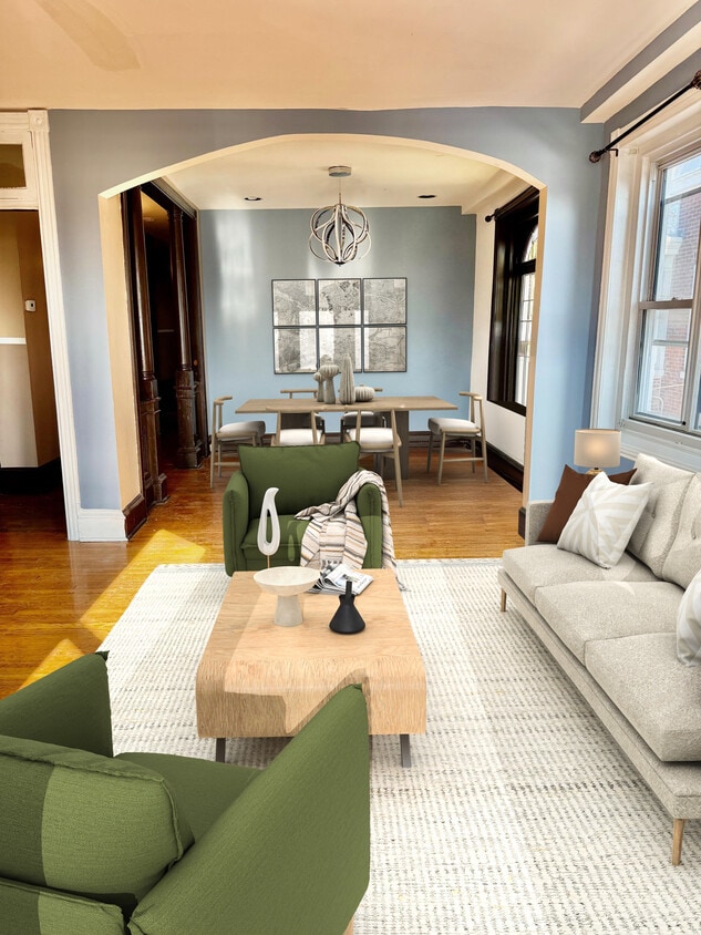 Welcome to 1115 Main St . This gracious building was a home in the late 1800’s. The entire 2nd floor is a very spacious 1,000 sf , one bedroom unit with many original finishes & features; high ceilings, custom Stain glass window, oversized windows throughout, Greek columns in the dining room. Some original hardwood floors and an building elegant entryway with arched doorways & home’s original hardwood handrails & baluster. Kitchen is very large 11x 11" with stainless appliances and plenty of cabinets and cooking area. Room for an eat -in, cafe table as well. Apartment features ample closet space too. A front porch is available for this unit’s use. One designated, off street parking space at rear driveway is included in lease. Apt available now. Good credit required. Ask agent for the requirements to qualify.