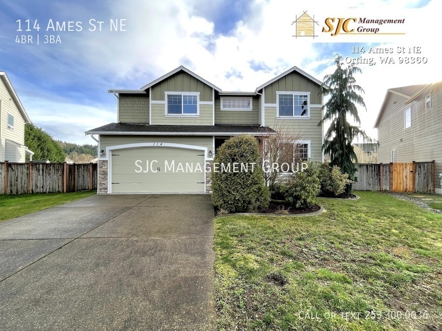 Gorgeous home in the beautiful Orting Valley. Enjoy views of Mt. Rainier, access to schools, parks, restaurants, golf and more! 4 bedrooms, plus office/den, 2.5 bathrooms. Upgrades include new carpet and paint, vinyl plank flooring, and AC. Downstairs features a large den/office with double doors, a powder room, and hallway closet. The kitchen showcases granite counter tops, a huge walk-in pantry, stainless steel appliances, and large island, then seamlessly opens to a dining space and family room with gas fireplace. Step out to the huge fully fenced backyard, complete with a matching shed. Upstairs you will find the spacious Primary Bedroom with en-suite bathroom featuring double sinks, soaking tub, separate shower and large walk-in closet. Three more bedrooms, one with a walk-in closet, the main bathroom, and a laundry room with provided washer & dryer. Schedule a showing or take our virtual tour today! Pets [breed and size restrictions may apply] are allowed, pet screening required. Approved pets will incur a pet mitigation fee (between $150 and $350) at move-in + a monthly pet fee of $35-$75, max two pets. For more information or to set up a viewing please contact the leasing team at SJC Management Group today! Please note showings can be scheduled online at any time. After hours or weekends, showings must be scheduled and confirmed by our staff before the end of the business day. Our business hours are Monday-Friday from 9 am to 5 pm. We are closed for all major holidays. ADDITIONAL TERMS: Required $85 at move in and additional $35 per month Resident Benefit Package offers an array of advantages. With this package, you'll enjoy convenient benefits such as regular delivery of furnace filters and additional perks designed to enhance your renting experience. Utilities: Tenant pays all Deposit: $3100