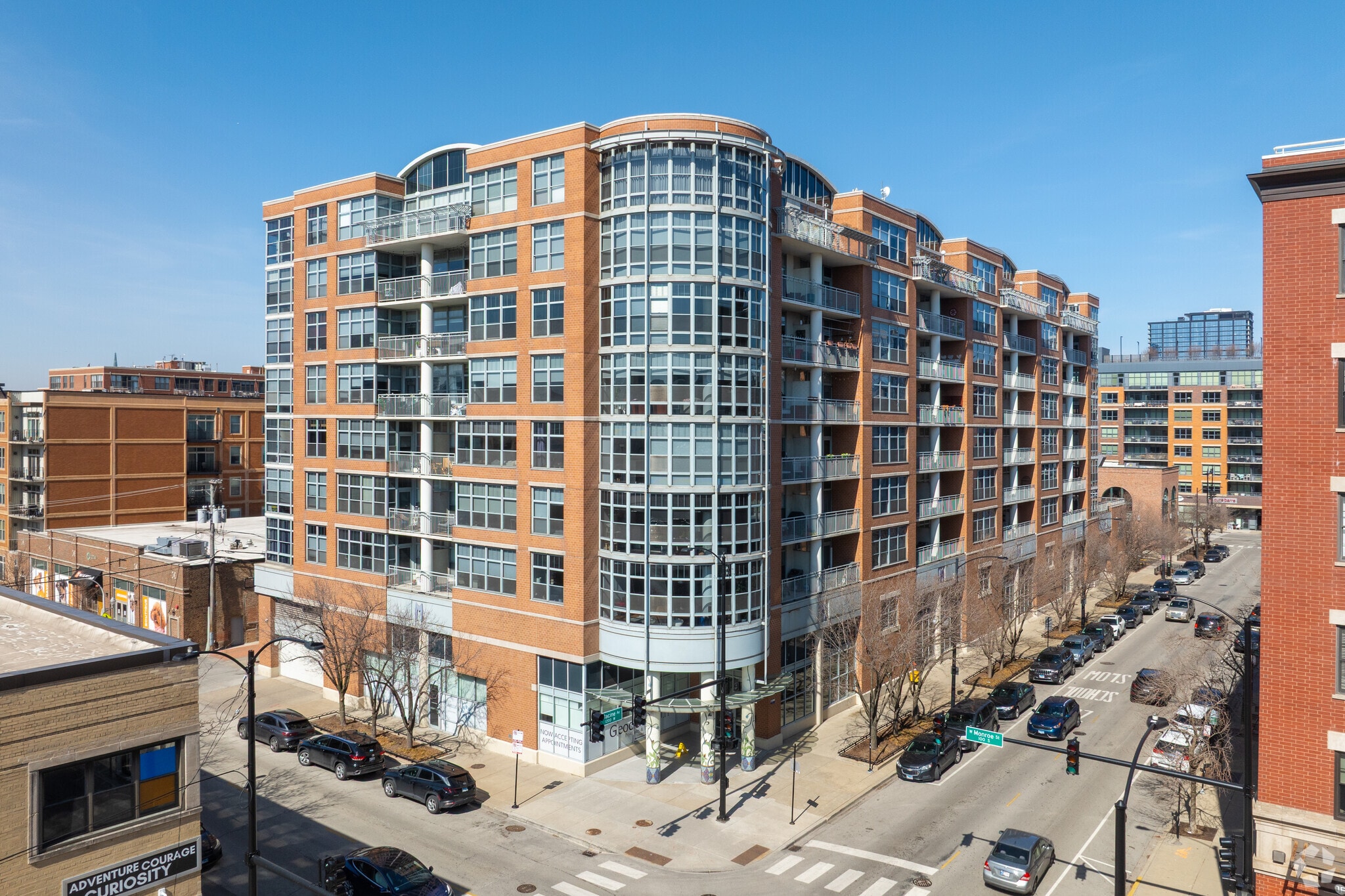 The Metro, an eight-story condominium building completed in 2003, stands as a modern residential option in Chicago's vibrant West Loop neighborhood. Designed with a combination of brickwork and large glass windows, the building features a distinctive curved glass facade on one corner, adding a unique touch to its otherwise straightforward design. With 136 units, The Metro offers a range of living spaces that cater to various needs and preferences.