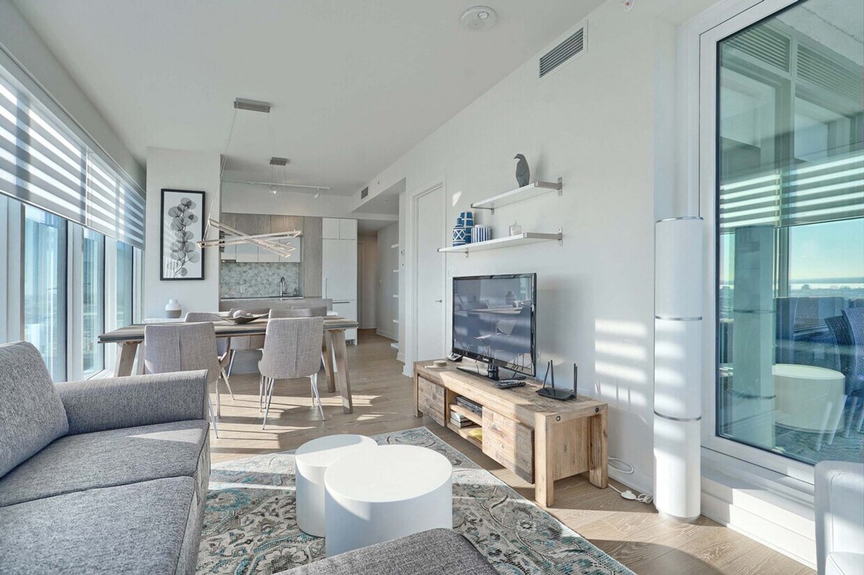 The advertised rate of C$4,893/month is the lowest available price, based on a 1 month(s) stay with a move-in date of June 20, 2026. Rates vary depending on the duration of stay, season, and other parameters. For exact pricing and additional pricing components, please visit our website and enter your desired move-in and move-out dates. The rate is applicable when billed upfront; it can be higher if billed in multiple payments. Welcome to Tour des Canadiens 2, where you can experience luxury in your newly renovated 980 sq. ft. furnished apartment featuring 10-foot ceilings, expansive sunlit windows, a private balcony, a spacious glass shower, high-end appliances, and an in-suite washer and dryer. Feel at home with every comfort imaginable. Socialize at the in-building bar, cellar, or pool table, and enjoy the convenience of being steps away from Bonaventure and Lucien L’Allier metro stations, trains, and Montreal’s underground network. After visiting some exceptional homes ourselves, we've strived to make this apartment as welcoming and cozy as possible. This space welcomes four guests with two bedrooms, two queen beds, and two full bathrooms. Enjoy a smart TV for your viewing pleasure and stay seamlessly connected with high-speed Wi-Fi throughout your stay. Indoor parking with in and out privileges is available for a separate fee depending on your length of stay. We offer a variety of cleaning services that include biweekly or monthly options. If you require this service, please contact us for more information. This service has an extra charge. Built in 2019, this apartment offers a fantastic terrace with BBQ grills, an indoor swimming pool, a sauna and jacuzzi, a fitness center, an entertainment room with a pool table, a bar and cellar, and a 24/7 security desk. Just steps away from the Bonaventure metro station, train, and the Montreal underground network. No parties of any kind or loud noises that can alter the harmony of residents are allowed. No smoking of cannabis, cigarettes, or any kind is permitted inside the apartment, balcony, or the building. Please care about your home away from home. [SI]