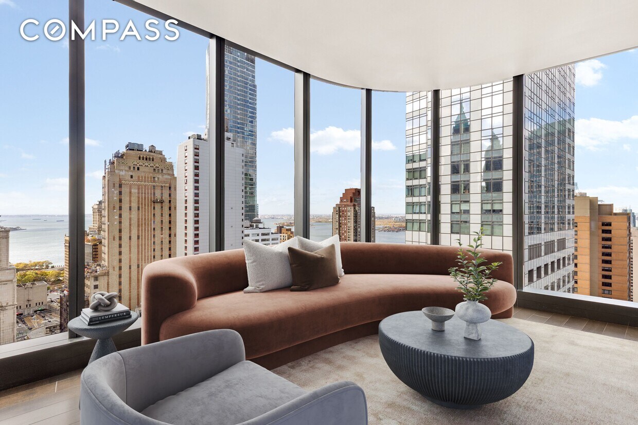 Residence 37C at The Greenwich Condominium by Rafael Vinoly, a two-bedroom, two-and-a-half-bathroom home showcasing southern and western exposures with panoramic views. Immerse yourself in the breathtaking views visible through floor-to-ceiling windows, and ceiling heights that extend over 10 feet, creating a dynamic canvas of the city skyline and waterfront. At 1,668 square feet of living space, this home offers meticulously designed living areas, featuring interior finishes by the esteemed design firm, MAWD. The formal entry foyer opens to the gracious living space, lined with 6" wide white oak flooring in dark brown finish. The custom designed kitchen with center island features a full suite of Miele appliances, a vented hood, polished nickel fixtures, cabinets in dark grey finish, with marble countertops and backsplash. The south facing primary bathroom features a wall of custom designed closets as well as a large dressing room. The custom designed primary en-suite bathroom features a wet room, floor-to-ceiling Covelano marble, radiant heated floors, a custom wall-mounted vanity and faucet, and medicine cabinet with recessed lighting. The west facing secondary bedroom has a bathroom en-suite and generous closet space. A Miele washer and dryer and a climate control thermostat completes this home. The Greenwich Club covers over 27,000 square feet of indoor and outdoor amenities serving as an extension of this home. Floors 86th to 88th are dedicated to an extensive collection of amenities including a fitness center with separate weight room, yoga, and pilates studio, 50" saltwater lap pool with double-height floor-to-ceiling windows and comfortable loungers throughout. The spa includes sauna, steam, and separate changing rooms, a relaxation lounge. There are also a private dining room with fireplace and catering kitchen, and screening room with projector. The additional 16th floor has a multifunctional lounge with private call pods, a coffee bar with pantry and wet bar for private functions. An indoor/outdoor toddler recreation area, and a landscaped outdoor terrace with private grill stations, dining areas, and a fire pit complete the spaces. The Greenwich is a 24-hour doorman, hand-delivered mail service, full time concierge building. There are cold storage for short term grocery deliveries and commercial-grade laundry room. 1st Month Rent and Security Deposit due at lease signing. Please note the following building and management fees as well: 1. Application processing fee (non-refundable): $700 2. Move in fee (non-refundable): $500 3. Move in deposit (refundable): $2,500 4. Application initiation fee (non-refundable): $75 5. Digital submission fee (non-refundable): $65 Available for immediate occupancy with building approval. Be the first to live in this magnificent home!