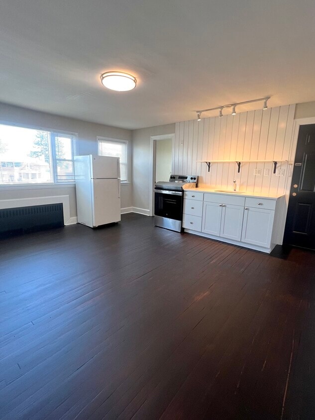 Updated one bedroom located above a commercial auto repair/ auto dealer. Heat and electric included in rent. New kitchen cabinets and updated bathroom.