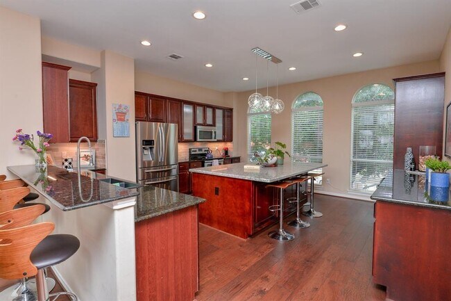 Awesome location. Walk to everything…. BBVA Compass Stadium, Toyota Center, Discovery Green, 8th Wonder and more!!! Light, bright & airy with towering ceilings and an open concept, modern floorplan. Fabulous and functional… wood-style tile flooring. Large living with wall of windows & balcony with AMAZING CITY VIEWS. Chef-inspired island kitchen with granite counters, stainless steel appliances and wine storage. Loft-style gameroom up with wet bar and wood style flooring. Large Primary Bedroom with w ensuite offering large soaking tub and oversized separate shower. Specious secondary bedroom with ensuite with tub/shower combo. Cute half bath down. Green space in front. Plenty to love!