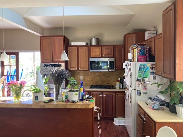 Here are some features of the house: * Quiet residential neighborhood, walking distance to Breads of India and Cafe Trieste * Pleasant 15 minute walk to North Berkeley BART * Interior tastefully painted * Hardwood entry way leading into formal living room with fireplace * Large bright living room with two exposures with formal dining room all on main level * Gas furnace * 2 bedrooms and 1 bath on upper level with 1 spacious closet and 1 smaller closet along with a linen closet and hardwood floors in each room * 1 bedroom and brand new bath on ground level with french doors to backyard providing separate entrance * Newly remodeled office with large storage area * Large remodeled kitchen with plenty of cherry cabinets, granite counter tops, gas cook top, built in oven, microwave, refrigerator, dishwasher, and disposal, flooded with light from skylight. * Large level lot with great deck * Full size energy efficient front load washer and dryer * Parking via driveway, or garage can be used as large storage * Residents handle all utilities. Owner pays garbage service * Built in 1939, home has plenty of original charm * Home square footage is 1450 approx and feels spacious, with good separation between living and entertaining areas. *Lot is 4600 sqft. Updated photos to come Cats ok . Small Dogs (under 25lbs) considered