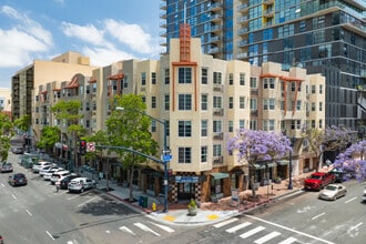 Portico is a five-story condominium building completed in 2005, located in the vibrant Little Italy neighborhood of Downtown San Diego. With 84 units, this modern structure offers a contemporary living experience amidst one of the city's most dynamic areas. The building's facade features a mix of geometric patterns and varied window shapes, giving it a distinctive yet understated appearance. Its prime location places residents within walking distance of some of the best dining, shopping, and cultural experiences San Diego has to offer.
