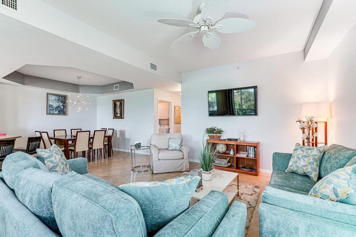 Feel at home in this beautiful vacation rental condo in Fort Myers, perfect for an extended stay with your loved ones. This condo features 2 bedrooms and 2 bathrooms. This getaway offers a fully equipped kitchen with stainless steel appliances, a microwave, a Keurig coffee maker, a toaster, a Crockpot, cooking basics, dishware and flatware, and a breakfast bar with 2 stools. Enjoy the convenience of in-unit laundry machines, a Smart TV with cable, a screened lanai, 2 dining tables, a walk-in closet, linens and towels, complimentary toiletries, central heating and air conditioning, ceiling fans, and keyless entry. Access to community amenities, including a clubhouse with a bar and restaurant, an outdoor pool, a hot tub, a fitness center, a tennis court, and a pickleball court, is available for a fee. Designated parking for 1 vehicle is available, along with open parking for 1 additional vehicle. Enjoy the sun on Yacht Club Public Beach, hit the links at one of the nearby golf courses, or explore the sights of Fort Myers and Cape Coral. Smoking, pets, events, parties, and large gatherings are not allowed. Guests must be at least 25 years old to book. A non-refundable $500 transfer fee and $27.69 admin fee are required to be paid no later than 7 days in advance of your stay. This property features a Ring Doorbell device with an exterior security camera facing the front outdoor entry. The camera does not look into any interior spaces, and the camera does not actively record video or sound while guests are in residence. [SI]
