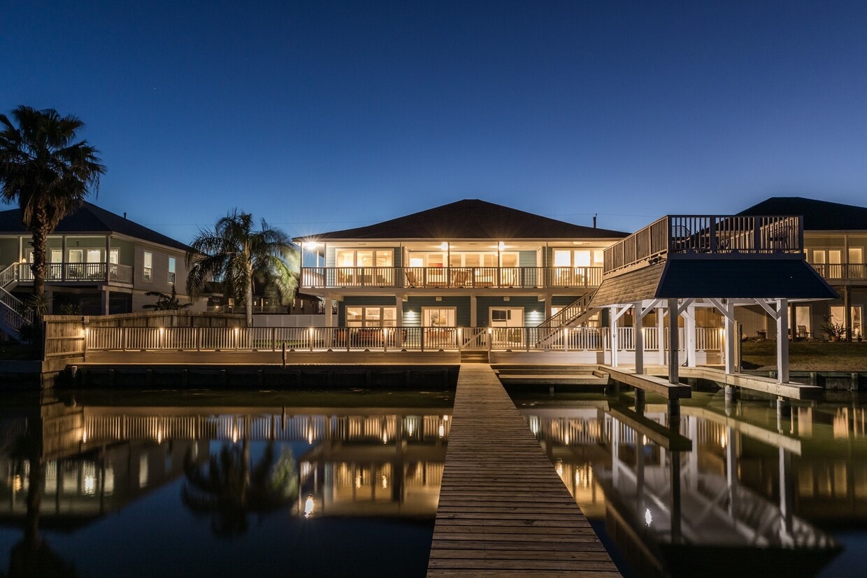 Waterfront living with deep water access that is located in Crash Boat Basin. This home comes with bayfront living boathouse,200 foot pier that is perfect for fishing,boating,swimiming,kayaking,paddelboarding and more. Also comes with 4 tranquil private bedrooms,3 full baths and generous bunk room space. Relaxing living room,cozy library nook,media room,dining space,kitchen with island breakfast bar and breakfast dining area. Ground space also has formal entry,large entertaining space,3 car garage entrance. Recently renovated with a modern airy design and gorgeous furniture and furnishings. Minutes to beach,moody gardens,golf,shopping,restuarants,Evia amenities and more. This is your ultimate escape to enjoying morning sunrises and evening sunsets from your 3 decks and ground level covered porch. MLS# 38232576