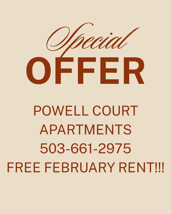 Welcome to Powell Court Apartments & Your new home!! We have 1, 2 and 3 bdrm apartments Call us TODAY for details and schedule a tour! Apply online at: Each of our units comes with the perfect galley-style kitchen for entertaining, great spaced living room, your patio, a full-size washer and dryer, a parking space that's all yours, a wonderful dog park, a playground, and lots more! Call us today to set up a tour at We are open from 10am-5:30 pm, Monday to Friday. Community Amenities: -Dog Park -Playground -Rentable Garages -Easy access to freeway, public transportation, and shopping -Assigned parking spot -Pet-friendly, (breed restricted) -On-line rent payments and resident services -On-site maintenance -Professional Onsite Community Management team Apartment Features: -Galley style kitchen -Separate Dining area -Balconies/patio w/storage -Laundry room in unit -Full size Washer/Dryer -Garbage disposal -Updated appliances & lighting -Lots of closets for indoor storage What are the other costs? $49,95 application fee pays for the screening. $500 Security deposit OAC- Up to one months rent depending on credit $65 Monthly Pet Rent $175 Monthly Garage rent Monthly water/sewer/trash based on usage Give us a call if you have any questions at We are open from 10 am-5:30 pm, Monday to Friday. Our community office is located next door at our sister property Sterling Park at: 16804 SE Powell Blvd Portland, OR, 97236 Southeast Portland, Garage available 1, 2 & 3 bedroom, playground, parking, w/d, new appliances, upgrade, SE Portland, Near Gresham, near shopping, near bus lines, near transit, near bus lines, private balcony, Pet-friendly, dog park.