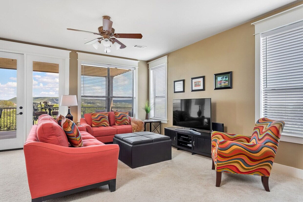 The advertised rate of $10,658/month is the lowest available price, based on a 30 day(s) stay with a move-in date of March 23, 2026. Rates vary depending on the duration of stay, season, and other parameters. For exact pricing and additional pricing components, please visit our website and enter your desired move-in and move-out dates. The rate is applicable when billed upfront; it can be higher if billed in multiple payments. Feel at home in this newly decorated 3-bedroom, 3-bathroom hilltop villa at The Hollows Resort, offering a secluded retreat with resort-level amenities, 30 minutes from Austin. The villa is accessible by elevator to the 3rd floor. The villa sleeps 8 and features high ceilings, recessed lighting, and an open-concept kitchen with granite countertops. The fully equipped kitchen has everything you need for cooking, including a gas range, dishwasher, and coffee maker. A fireplace anchors the living area. In-unit amenities include a washer and dryer and hair dryers. Full access to The Hollows' amenities is included, such as four resort pools (including an infinity-edge pool with lake views), two spa hot tubs, the Beach Club, a full fitness center, sand volleyball, horseshoes, an amphitheater, and over 15 miles of paved hiking, biking, and jogging trails. The Hilltop Smokehouse is steps away, and the private Northshore Marina gives you lake access for boating, kayaking, and paddle boarding. A golf cart is available for rent to get around the resort. Step out to your private patio and enjoy views of Lake Travis and the Texas Hill Country. The resort infinity pool and Beach Club are about 1 mile from the villa. The sunrise from the balcony is worth the trip on its own. [SI]