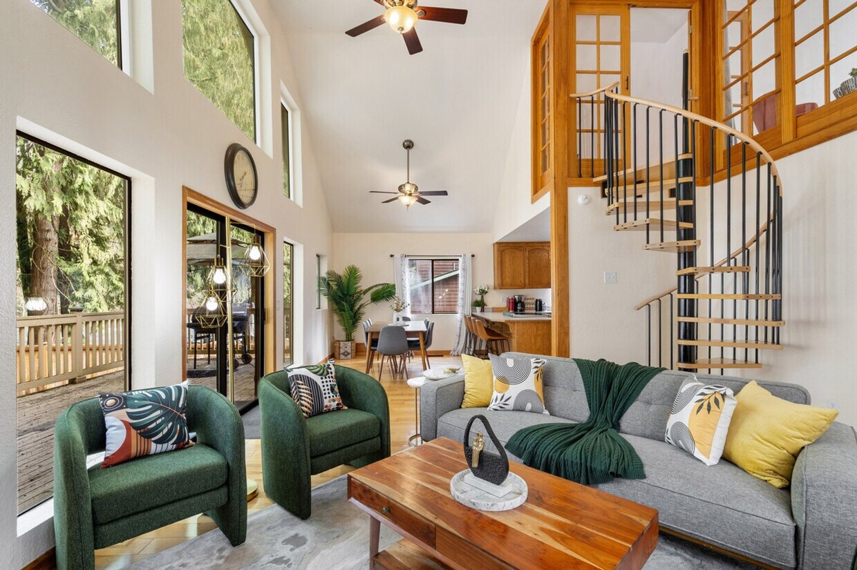 The advertised rate of $13,685/month is the lowest available price, based on a 30 day(s) stay with a move-in date of March 29, 2026. Rates vary depending on the duration of stay, season, and other parameters. For exact pricing and additional pricing components, please visit our website and enter your desired move-in and move-out dates. The rate is applicable when billed upfront; it can be higher if billed in multiple payments. Feel at home in this picturesque riverfront home, nestled on the banks of the Stillaguamish River. This home offers 4 bedrooms and 2.5 bathrooms. With the river flowing right through the backyard, this home offers a perfect blend of nature and luxury. The entrance opens to an open kitchen concept, tall ceiling living room with sliding doors leading to the deck and hot tub overlooking the river, all illuminated by hanging lights. The kitchen is well-appointed with every essential, and there's space to dine and hang out at the breakfast bar and the window-side table. The basement with its separated entrance has a karaoke set-up, dancing pod area, bar, a movie theater room and a cedar sauna. A cedar hot tub overlooks the river. There is a huge front yard and driveway for all your parking needs. You can even park multiple RV's if you want. This home is 5 mins from the town of Granite Falls and 20 mins from the Mt. Baker-Snoqualmie National Forest. In the cascades you will find some of the best hiking and most beautiful natural features that Washington has to offer, including Gothic Basin, Big Four Ice Caves, Mt. Pilchuck Fire Lookout, Lake Twenty-Two, and Heather Lake. Other outdoor recreation activities in the area are endless as well, including hiking, whitewater kayaking, river tubing, backcountry skiing, and fishing. The sauna, movie theatre and one bedroom is on a different floor with a different entrance in the basement. The 3rd floor (one bedroom with 3 beds) is only accessible via the spiral staircase. Any use of fireworks anywhere near the house will result in a $1000 fine. Do NOT try parking under the deck, it's not tall enough. [SI]