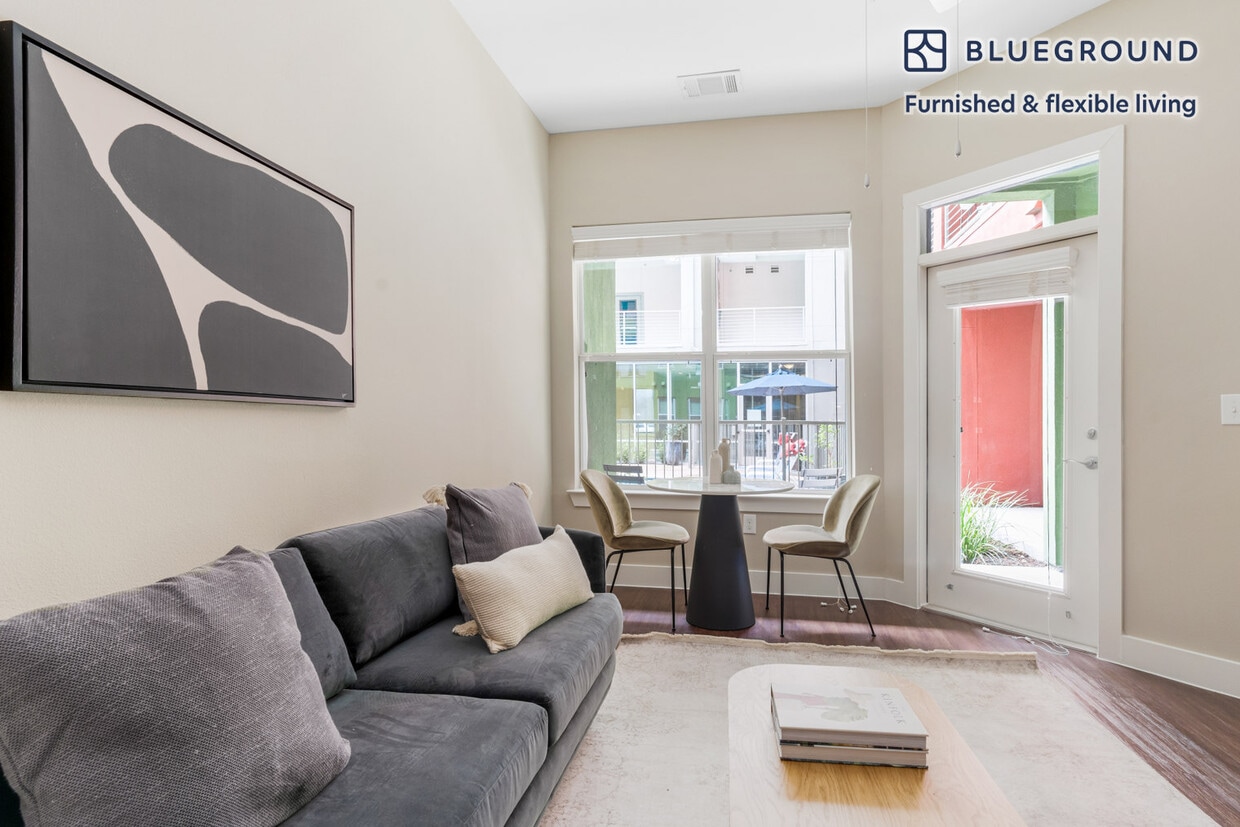 Discover the best of Austin, with this one bedroom apartment in Mueller Town Center District with balcony views over the city. It’ll be easy to simply show up and start living in this fashionably furnished apartment with its fully equipped kitchen, cozy living room, and our dedicated, on-the-ground support. (ID #ATX33) The advertised rate of $2,260/month is the lowest available price, based on a 11 month(s) and 29 day(s) stay with a move-in date of January 27, 2029. Rates vary depending on the duration of stay, season, and other parameters. For exact pricing and additional pricing components, please visit our website and enter your desired move-in and move-out dates. The rate is applicable when billed upfront; it can be higher if billed in multiple payments. Brokers are welcome to reach out. Were you looking for an unfurnished lease? Try Blueground instead and upgrade from unfurnished to furnished living: - Furnished at rates comparable to unfurnished - No setup or furniture costs - save thousands - Move-in ready - save time, just bring your suitcase Designed with you in mind Thoughtfully designed with bespoke finishes, modern furnishings, and a fully equipped kitchen, you’ll enjoy that “I’m home” feeling with this Blueground apartment. Whether you’re lounging in your cozy living room streaming the latest and greatest entertainment on the smart TV or premium wireless speaker, or getting some well-earned rest on the superior quality mattress with fully stocked linens, you’ll fall in love with everything this Mueller Town Center District apartment has to offer. This apartment also offers in-apartment laundry. Sleeping arrangements King Bed, 70.8in/180cm Amenities Building amenities unique to this one bedroom apartment include an on-site: - Dryer - Elevator - Swimming pool - Washing machine - Lounge - Parking - Pets allowed Arrival and ongoing support The entire apartment is yours to enjoy! Throughout your stay, you’ll have access to our Client Experience team through the Blueground App. You can schedule additional cleanings, submit maintenance requests, and view our neighborhood recommendations with just a few taps. We’ll share all details upon confirmation of your stay. Other things to note Building amenities may have an extra cost. This Blueground apartment has flexible lease options, allowing you to book it for one month, a year, or more. Pets are welcome, though weight limits and breed restrictions apply and may incur fees. Parking is offered based on availability and is subject to a fee. We take great pride in ensuring every photo displayed is shot in our own units with our actual furnishings. That said, we regularly refresh our decor and furniture arrangement, which may differ from what’s pictured. Also note - This apartment is accessible for people with physical disabilities [SI]