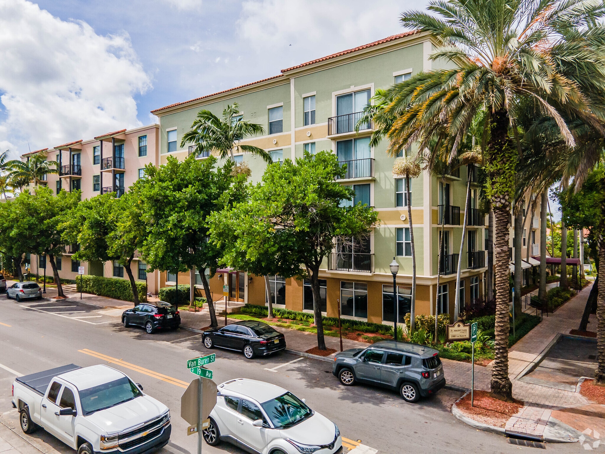 Regent Park At Young Circle is a five-story condominium building located in the vibrant Parkside neighborhood of downtown Hollywood. Completed in 2004, this modern complex features 253 units and offers a blend of contemporary design and urban convenience. The building's stucco exterior is complemented by a series of balconies and a symmetrical facade, creating a welcoming atmosphere for residents. The central entryway, flanked by palm trees, adds a touch of tropical charm to the property.