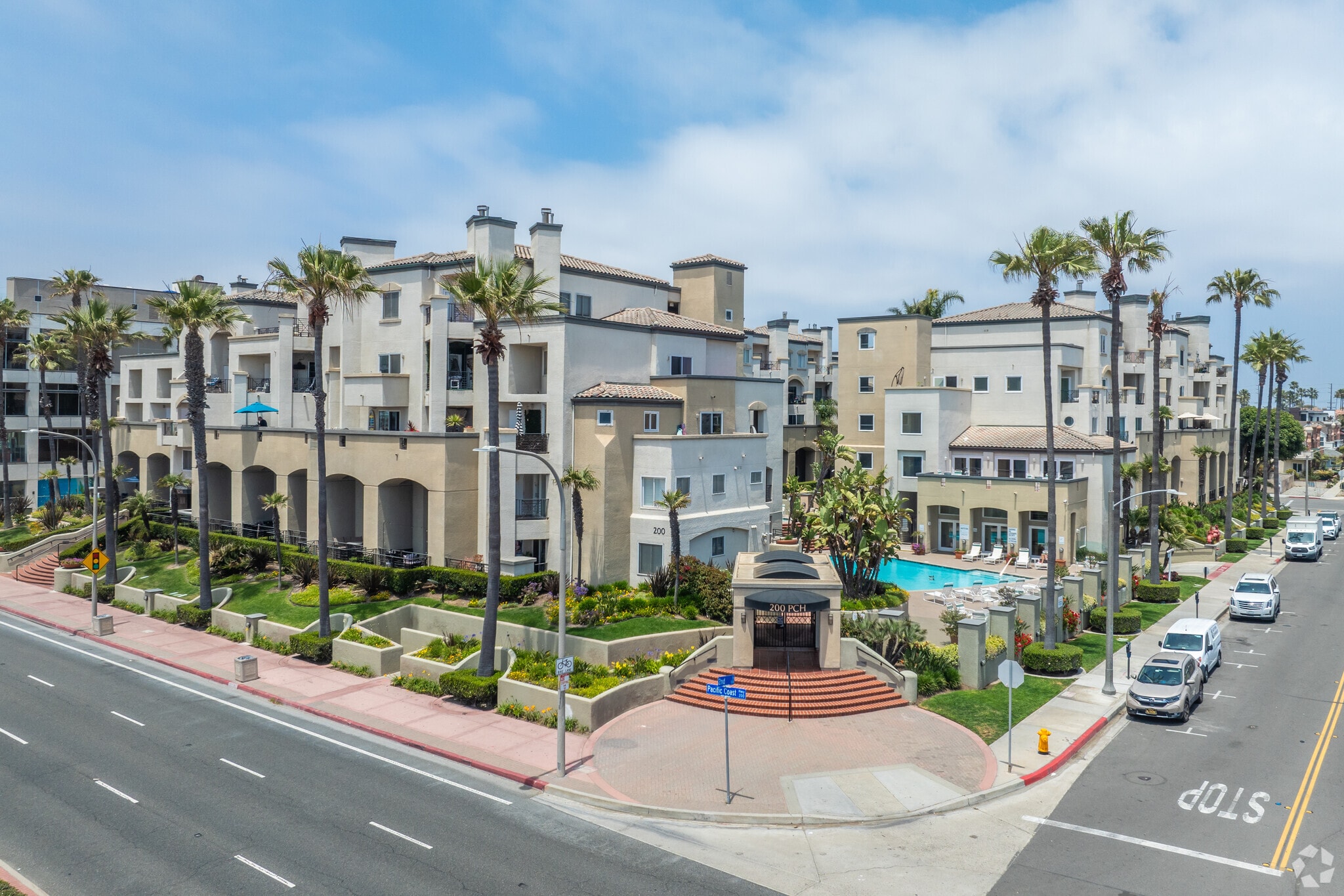 Pier Colony is a four-story condominium building located in the heart of Downtown Huntington Beach, California. Completed in 1989, this gated community comprises 100 units and offers a blend of modern comfort and coastal charm. The building's stucco exterior, arched openings on the ground level, and a mix of flat and sloped rooflines create a distinctive architectural profile. Balconies with metal railings and a central courtyard featuring a swimming pool add to the building's appeal. Residents enjoy the convenience of being steps away from the iconic Huntington Beach Pier and the vibrant Main Street.