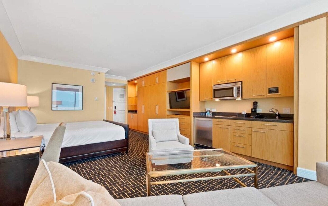 The advertised rate of $7,142/month is the lowest available price, based on a 30 day(s) stay with a move-in date of May 29, 2026. Rates vary depending on the duration of stay, season, and other parameters. For exact pricing and additional pricing components, please visit our website and enter your desired move-in and move-out dates. The rate is applicable when billed upfront; it can be higher if billed in multiple payments. Feel at home in this newly renovated studio at the Trump International Hotel™ Las Vegas, featuring a stunning marble entry, sleek modern décor, and floor-to-ceiling windows with breathtaking views of the Las Vegas Strip or surrounding mountains. This spacious studio is designed for effortless comfort and relaxation, featuring a fully equipped kitchenette with cookware and kitchen items upon request, a private bathroom with a soaking tub, Wi-Fi, cable TV, air conditioning, an iron and ironing board. Complimentary amenities include daily housekeeping service, bottled water and coffee refreshed daily, robes, slippers, extra blankets, and fresh linens available upon request. Pets under 25 lbs are welcome with a $200 pet fee. Valet parking is complimentary. Cribs are available. Located steps from the Fashion Show Mall and a short walk to the Las Vegas Strip, Wynn, Resorts World, and Treasure Island, this elegant studio places you in the center of Vegas’ premier shopping, dining, and entertainment. Enjoy easy access to iconic landmarks like the Bellagio Fountains and the Fremont Street Experience. Check-in time is 4:00 PM and check-out is 11:00 AM. A resort fee of $65/day includes pool and gym access, daily housekeeping, fresh towels and linens, and free bottled water and coffee daily. This is a non-smoking and non-gaming retreat. Guests must be 21+ to check in without a guardian. Enjoy resort-style living with full access to premium amenities including a full-service spa, resort-style pool, state-of-the-art gym, and fine dining. [SI]