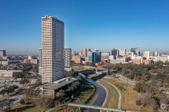 The Spires, a 40-story condominium building completed in 1983, is located in the vibrant Texas Medical Center area of Houston. With 264 units, this high-rise offers a range of living options for those seeking a blend of convenience and comfort. The building's simple, modern design features a grid-like pattern of windows and balconies, providing residents with stunning views of Hermann Park, the Downtown skyline, and the Texas Medical Center.