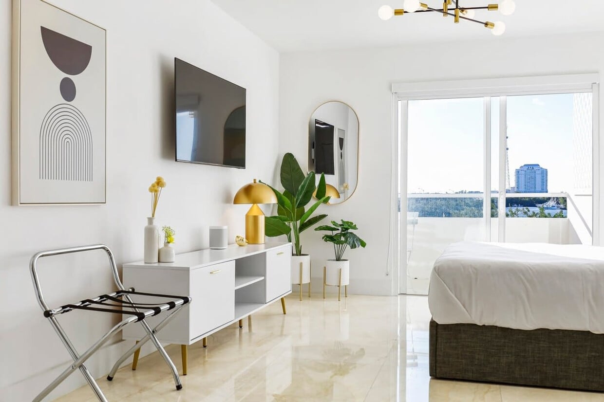 The advertised rate of $2,878/month is the lowest available price, based on a 30 day(s) stay with a move-in date of May 13, 2026. Rates vary depending on the duration of stay, season, and other parameters. For exact pricing and additional pricing components, please visit our website and enter your desired move-in and move-out dates. The rate is applicable when billed upfront; it can be higher if billed in multiple payments. Welcome to La Marinita, a contemporary studio nestled by the marina with stunning bay views. Experience the perfect mix of tranquility and city convenience in this fully renovated space, designed with no expense spared. Enjoy serene bay views, modern amenities, and easy access to all that Miami has to offer. Plus, you're just a short walk from the future AFA/Messi Soccer Academy! This studio boasts incredible views and has been fully remodeled and freshly designed. It features a fully equipped kitchen and offers on-site parking for up to two cars. Comfortable sleeping arrangements include a queen bed and a futon for additional accommodations. The kitchen is fully equipped for your culinary adventures, including modern appliances and cookware. There is an accessible laundry room on the same floor, with laundry cards available for purchase in the lobby. Concierge services are available for booking local experiences like boat rentals, chefs, or massages. The studio includes WiFi, Smart TVs, an ironing set, laundry facilities, and starter toiletries. Note that washcloths and kitchen towels are not included. Located in North Bay Village, this studio provides easy access to Miami Beach, Wynwood Walls, Downtown Miami, Bal Harbour Shops, and the Miami Design District. Just a short stroll from the future AFA/Messi Soccer Academy, the neighborhood is known for its dynamic urban ambiance, with a plethora of restaurants, chic coffee shops, and serene parks. We recommend renting a car or taking Uber for convenient transportation. Check-in is after 4 PM and checkout is before 11 AM, with early or late options available upon inquiry. Pets are not permitted in the studio. Quiet hours begin at 10 PM, and the number of guests cannot exceed those specified at booking. No additional visitors or overnight guests without prior approval, with violations incurring a $50 fee per person and potential termination of stay without refund. All guests must be 21 years or older unless accompanied by a parent or pre-approved. No underage drinking, drugs, marijuana, or vaping are allowed, with any smoke smell incurring a $100 cleaning fee. Security cameras are in use outside for protection. The TV is for streaming with your own login, no network channels. Respect the residential area and noise ordinance between 10 PM and 8 AM, as violations may result in police visits and immediate eviction. Includes WiFi and Smart TVs for your entertainment and connectivity needs. A laptop computer is not included. [SI]