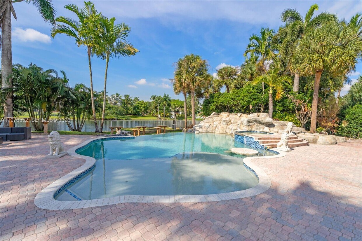 Beautiful waterfront estate in the prestigious gated community of Emerald Springs Estates. Huge open great room floor plan. 7 rooms in total, 5 large bedrooms (all 5 suites), plus two dens that can be utilized as offices or maids quarter, 6 bathrooms, formal living room, family room, also a large Florida room, gas range, stainless steel appliances, wood burning fireplace. Entire rear of house is glassed for ultimate view of the infinity pool (heated), rock water falls and spa, lake front, whole house generator, solar panels, extended 3 car garage, most of the home is impact glass with some rolladen shutters in some areas (minimal), full alarm system installed with built in camera system, speakers throughout great room, patio and pool area, and lush landscaping. Pool and lawn maintenance are included in the price. Available for 6-12 month lease with option to renew long term. Listing Courtesy of: Maleny Carrasco/Lifestyle International Realty