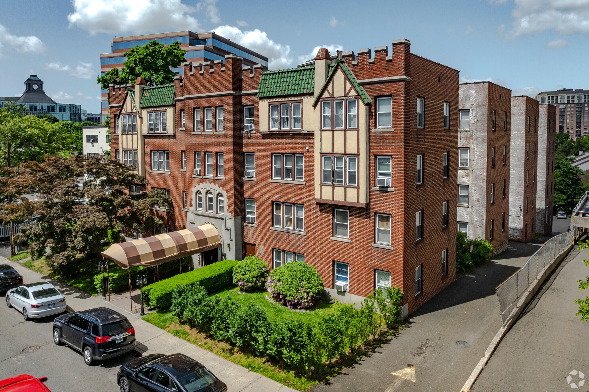 Glenbrook Road Condominiums, a four-story building completed in 1928, offers a unique blend of historical architecture and modern living. With its Tudor Revival style, the building features decorative half-timbering, steeply pitched gable roofs, and tall, narrow windows. Located in the vibrant Downtown Stamford area, this condominium houses 64 units, providing a cozy yet dynamic living environment.