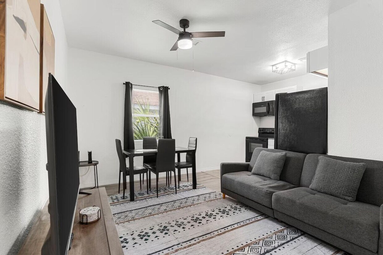 The advertised rate of $4,278/month is the lowest available price, based on a 1 month(s) stay with a move-in date of June 29, 2026. Rates vary depending on the duration of stay, season, and other parameters. For exact pricing and additional pricing components, please visit our website and enter your desired move-in and move-out dates. The rate is applicable when billed upfront; it can be higher if billed in multiple payments. Feel at home in this charming single-story apartment featuring two bedrooms and one bathroom. The residence offers a king-size bed, a queen-size bed, and a sofa bed, making it ideal for a variety of guests. Enjoy the convenience of a washer and dryer, a fully equipped kitchen, and a dining set. Relax in the cozy living area with three smart TVs or unwind on the front porch and backyard. With free parking and self-check-in, your stay is hassle-free. The kitchen is fully equipped with a full-size fridge, a 4-burner stove, a microwave, an oven, an air fryer, a blender, and all necessary cookware. Enjoy your meals with the provided seasoning, coffee maker, and drinking and wine glasses. Each bedroom is equipped with a desk and chair, perfect for work or study, and high-speed WiFi is available throughout the apartment. Pets are welcome with a non-refundable fee of $150 per pet. Enjoy the convenience of free parking during your stay. Located conveniently close to Tampa's attractions, this apartment is just 1 mile from Ybor, 2.4 miles from Armature Works and Downtown Tampa, and 2.5 miles from the Florida Aquarium. Sports and entertainment venues like Amalie Arena and Raymond James Stadium are within a short drive, as are the University of Tampa and the University of South Florida. The Tampa International Airport is only 7.7 miles away, making travel easy. The apartment is pet-friendly and offers self check-in with a smart lock. Blackout curtains are provided for your comfort. Each bedroom is equipped with a desk and chair, providing a comfortable space for remote work. High-speed WiFi ensures you stay connected throughout your stay. [SI]
