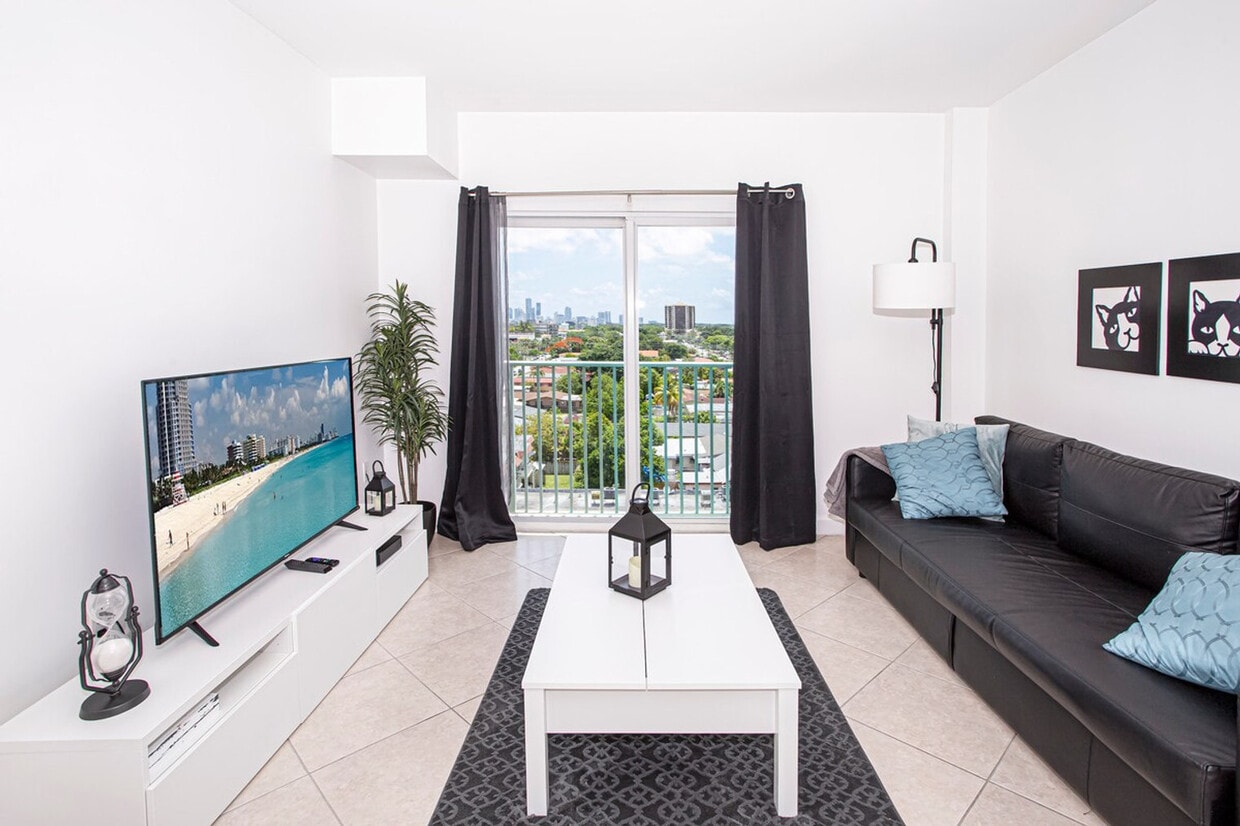 The advertised rate of $3,882/month is the lowest available price, based on a 30 day(s) stay with a move-in date of May 12, 2026. Rates vary depending on the duration of stay, season, and other parameters. For exact pricing and additional pricing components, please visit our website and enter your desired move-in and move-out dates. The rate is applicable when billed upfront; it can be higher if billed in multiple payments. Feel at home in this bright and modern 1-bedroom apartment, where large windows fill the space with natural light and offer city views. The apartment is located on the 6th floor and is accessible via self check-in with a smart lock. The living area features a comfortable sofa bed and a Smart TV. The private bedroom has a cozy queen-size bed and a second Smart TV. The fully equipped kitchen includes a coffee machine, blender, toaster, pots, pans, cooking essentials, an in-unit washer and dryer, an iron, an ironing board, a steam iron, a hair dryer, a safe box, and a luggage rack. A starter supply of daily essentials, including towels, shampoo, soap, toilet paper, and paper towels, is provided. Parking is included for one compact car. A pet is welcome with a $50 fee, with a maximum weight of 20 pounds. With a Walk Score of 92, this apartment is in a safe neighborhood and is conveniently located a half block from the bus/trolley stop and within walking distance to shops. It's a 10-minute walk to Downtown Coral Gables, 5.4 miles from Downtown Miami, 4.5 miles from Miami Airport, 8.9 miles from the Port of Miami, and 11 miles from South Beach. Smoking is not allowed inside the apartment, and a $450 fine will be imposed for violations. Includes a dedicated desk and high-speed Wi-Fi. [SI]