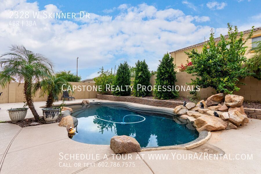 This well-appointed 4-bedroom, 2.5-bathroom home offers generous living space, thoughtful design, and a backyard made for relaxing and entertaining. With a functional floor plan and inviting indoor-outdoor flow, this home is ideal for comfortable everyday living. Key Features: Versatile Living Spaces: Formal living and dining rooms, plus a large great room/family room that opens to the kitchen and overlooks the patio and pool. Well-Equipped Kitchen: Granite countertops, center island, wood cabinetry, modern stainless steel appliances and a spacious pantry. Comfortable Bedrooms: Four upstairs bedrooms with large closets and a hall bathroom featuring double sinks. Primary Suite: Includes two closets, double sinks with vanity, a walk-in shower, and a soaking tub. Convenient Layout: Large laundry room, half bath on the main level, and a 2-car garage with built-in cabinets. Flooring: A mix of wood-look tile and carpet throughout the home. Outdoor Living & Location Enjoy a private, resort-style backyard perfect for entertaining or unwinding. The home is well maintained and designed for both comfort and functionality, offering ample space inside and out. Don’t miss this opportunity to enjoy a spacious home with standout features and a beautiful backyard. Schedule a tour today! -- Monthly Fee: Resident Benefit Package $49.99 Security Deposit: Equal to one months rent Cleaning Deposit: $400.00 Pet Deposit: $200.00 per pet One Time Lease Administrative Fee: $150.00 Dryer Irrigation System Pool Non Heated Smoke Detectors Washer Wood Floor Tiles