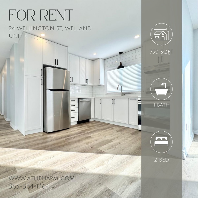 24 Wellington St, Welland – Unit 9 This newly renovated 2-bedroom, 1-bathroom upper unit offers clean, modern living in a secure and well-maintained apartment building located in central Welland. Features: 2 Bedrooms, 1 Bathroom Approx. 750 Sq Ft Stainless Steel Fridge, Stove, Dishwasher Private Balcony Tenant-Controlled Heat/AC Coined Laundry Onsite Parking Available in Building Lot Secure Building with Locked Entry Biweekly Common Area Cleaning Nearby Amenities: Quick access to public transit, grocery stores, and downtown Welland Nearby parks, trails, and the Welland Canal for outdoor recreation Rent: $1,700/month + hydro Availability: Immediate Book a Viewing: Call us at Schedule Online: Virtual Video Tour Requests: