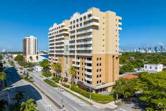 Catalonia at Silver Bluff is a 14-story condominium completed in 2007, located in the vibrant Northeast Coconut Grove neighborhood of Miami. With 56 units, this building offers a contemporary living experience amidst one of the city's greenest areas. The building's neutral color palette and symmetrical facade, featuring arched detailing around the central windows, provide a welcoming entrance for residents and visitors alike.