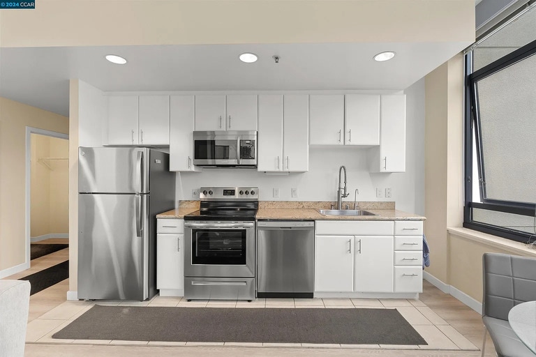 Light-filled corner unit with floor-to-ceiling windows, stunning downtown views, in-unit laundry, new stainless steel kitchen appliances, and updated finishes. Includes 1 garage parking space and access to pool, spa, fitness center, and 24-hour door service. Walk to Oracle Park, Chase Center, tech offices, and transit.