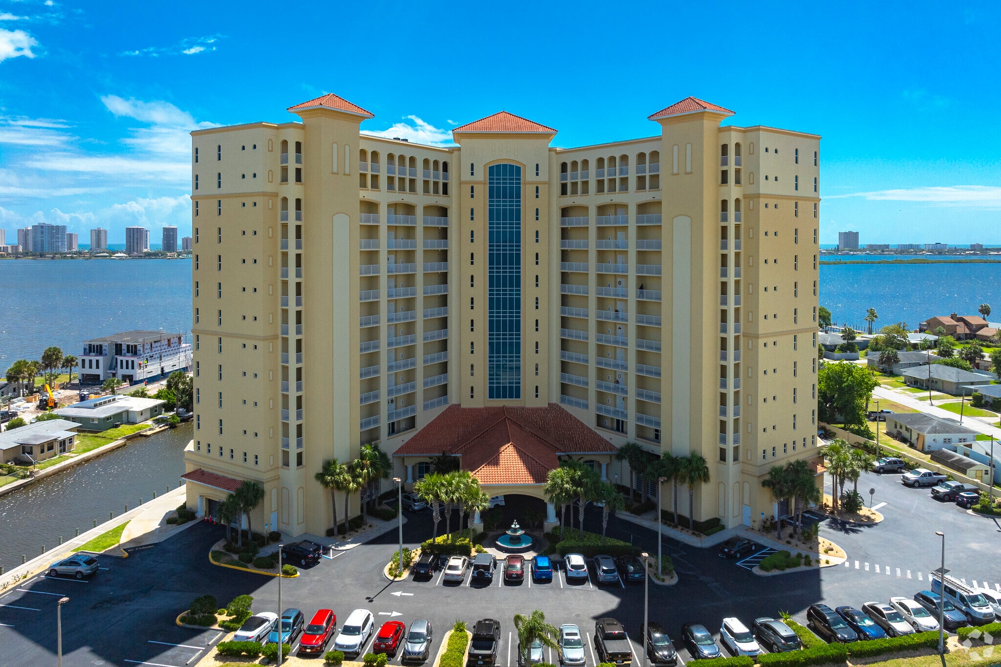 Halifax Landing is a 15-story condominium building completed in 2008, located along the scenic Halifax River in South Daytona, Florida. Designed with a symmetrical facade and distinctive red tile roof, the building features 186 units, offering residents a blend of modern amenities and waterfront views. The central section of the building extends above the roofline, flanked by two wings with balconies, providing a unique architectural touch.
