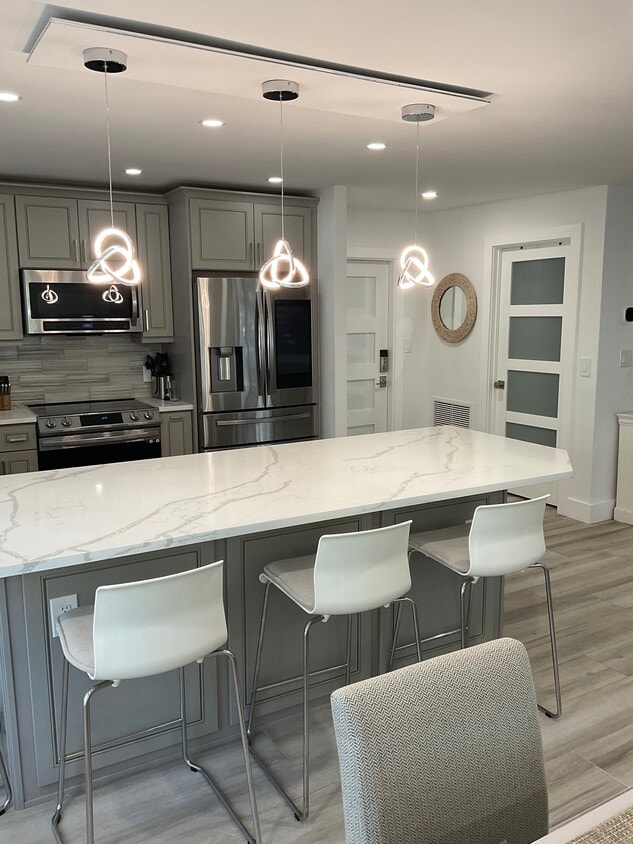 This newly renovated condo is available for long term lease only (12 months). Located at the 14th St bridge of the intracoastal in Pompano Beach. Corner ground floor, Conveniently located walking distance from the beach. 2 bedroom/2 full baths, with bonus pullout wall unit that has office space behind it. Wall unit pulls out for when in use, or just push it back for max space in the living room. All furniture is included as shown in pictures. Washer and dryer is in unit, no need to use common area laundry room. Parking spot is steps away from the front door. Water and Wi-Fi is included in the rent ! Pompano Boat launch park is located directly across the street. Pool area with bbq for grilling , Has small gym to work out in. Association requires minimum *700*credit score for all tenants.* REQUIRED: First, last month’s rent and security deposit, plus one additional month’s rent required for the association’s security. ( deposits are refunded at lease end ) NO pets allowed please.