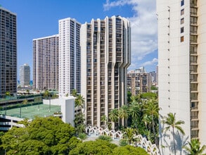 Liliuokalani Gardens, completed in 1984, stands as a 25-story residential haven in the vibrant Waikiki neighborhood. This condominium complex, designed by Archinoetics Llc, houses 385 units across its towering structure. The building's name pays homage to Queen Liliuokalani, Hawaii's last reigning monarch, as it occupies the site of her former personal gardens. Several trees on the property date back to the Queen's era, serving as living links to Hawaii's royal past. The complex blends modern living with historical significance, offering residents a unique connection to the islands' rich cultural heritage while providing contemporary comforts and amenities.