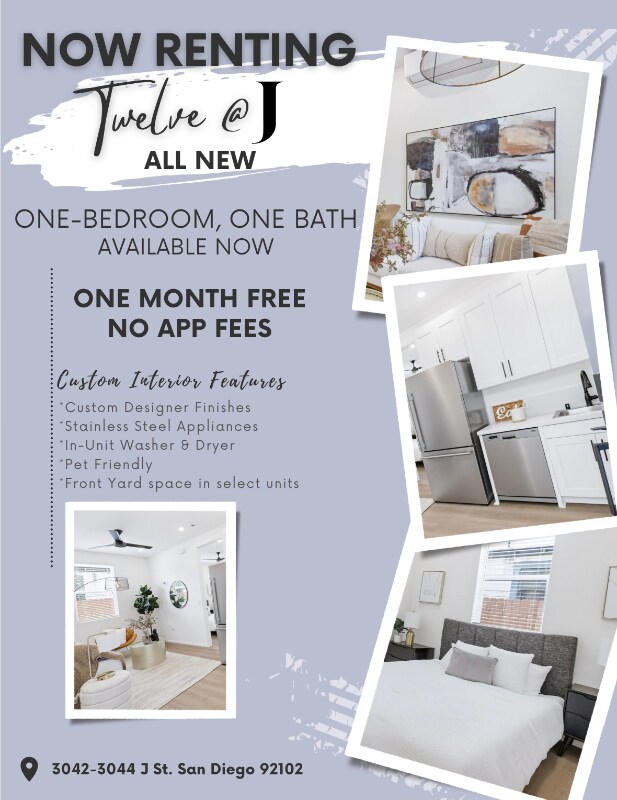 Property Id: 2234755 Twelve @ J | Brand-New Luxury Living in Golden Hill located at 3042-3044 J St. Be among the first to experience San Diego's newest boutique apartment community located in the heart of Golden Hill. This One-Bedroom has been thoughtfully designed with custom finishes, stainless steel appliances, and in-unit washer and dryer! Special - One Month Free Rent plus no Application Fees Enjoy the perfect blend of comfort, convenience, and style — all in one of San Diego's most vibrant neighborhoods, just minutes from Downtown, Balboa Park, and South Park. Features & Highlights: *Studios, One-Bedroom & Two-Bedroom Floor Plans *Custom Designer Finishes *Stainless Steel Appliances *In-Unit Washer & Dryer *Pet Friendly *Downstairs Water/Sewer/Trash - RUBS program - Billing is based on Sq. Ft. and Occupancy Prime Golden Hill Location near Downtown San Diego Don't miss your chance to call this all-new community home. Inquire at Rental Criteria - Credit score of 600 or higher, Gross Income of 2.5 x the monthly rent.