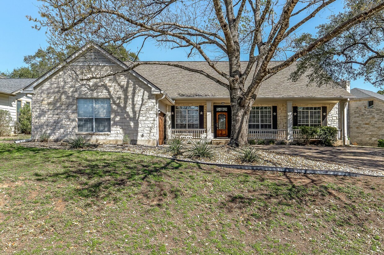 Welcome to 306 Copperleaf, a freshly painted one-story ranch-style home offering comfort, convenience, and character. A circular driveway and inviting covered front porch set the tone for this welcoming property, while the expansive covered back patio stretching the length of the home, along with an additional patio, provide ideal spaces for outdoor relaxation and entertaining. The backyard enjoys cool afternoon shade, perfect for quiet evenings outdoors. Inside, the home features travertine tile flooring throughout the great room, kitchen, breakfast area, and dining spaces. The kitchen boasts abundant white cabinetry with sleek stainless handles and soft-close drawers, granite countertops, double ovens, a microwave, and a large island perfect for meal preparation or casual gatherings. Four bedrooms with the primary suite offering double closets for ample storage. New roof installed in 2025. Ideally located near Lake Travis with easy access to shopping, dining, parks, and medical facilities.
