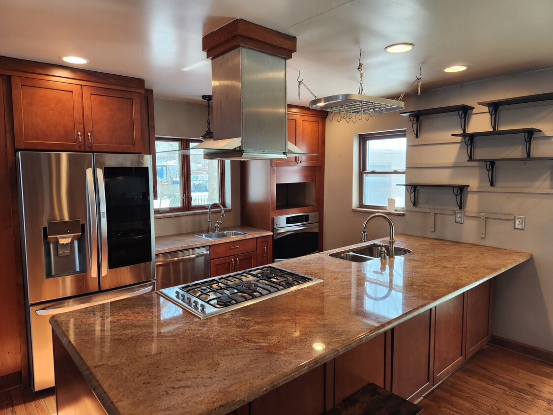 Spacious and modernized Ranch house with Gourmet Chefs Kitchen! Welcome to a home designed for both comfort and entertainment! This beautifully maintained property features a stunning open-concept living space, high-end finishes and versatile layout for modern living. Kitchen: This home features an expansive granite island with built in gas range, stainless steel appliances, French-door refrigerator (with unlimited ice), and a sleek professional grade vent hood. There is ample cabinet space, wine storage, open shelving and secondary prep sink. Living Space: Enjoy recessed lighting throughout the home, large windows for natural light, ceiling fans. Laundry: The space comes with a dedicated laundry room with a modern washer, dryer and additional shelving Indoor-Outdoor: Sliding door from kitchen opens up to the shared fenced backyard with tall oak trees providing ample shade in the summer Key features: Hardwood floors, central heating/cooling, modern stainless steel appliances DTE AND HIGH SPEED INTERNET INCLUDED Area: Excellent neighbors in a quiet neighborhood. Sidewalks and bike friendly! Across the street from major garden city parks and USPS! 5 min walk to Kroger, CVS, Chase bank and other amenities. 10 minutes walk to ford road with many restaurants and shops. 5 min drive to DTW airport
