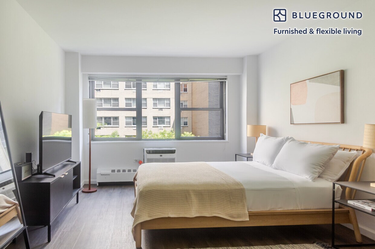 Show up and start living from day one in New York with this cheery studio Blueground apartment. You’ll love coming home to this thoughtfully furnished, beautifully designed, and fully equipped Midtown East home with stunning views over the city. (ID #NYC1954) The advertised rate of $3,920/month is the lowest available price, based on a 10 month(s) and 24 day(s) stay with a move-in date of October 2, 2029. Rates vary depending on the duration of stay, season, and other parameters. For exact pricing and additional pricing components, please visit our website and enter your desired move-in and move-out dates. The rate is applicable when billed upfront; it can be higher if billed in multiple payments. Brokers are welcome to reach out. Were you looking for an unfurnished lease? Try Blueground instead and upgrade from unfurnished to furnished living: - Furnished at rates comparable to unfurnished - No setup or furniture costs - save thousands - Move-in ready - save time, just bring your suitcase Designed with you in mind As with any Blueground apartment, you’ll find a thoughtfully designed space complete with beautiful furniture and a fully equipped kitchen in this studio property. And, thanks to our superior quality mattresses, fully stocked linens, and towels, you can relax knowing you’ll always feel comfortably at home. When you’re ready for some fun, you can take in the New York vibes or bring the entertainment to you with the premium wireless speaker or smart TV. Sleeping arrangements Queen Bed, 63in/160cm Amenities Building amenities unique to this studio apartment include an on-site: - Doorman - Dryer in building - Elevator - Washing machine in building Arrival and ongoing support The entire apartment is yours to enjoy! Throughout your stay, you’ll have access to our Client Experience team through the Blueground App. You can schedule additional cleanings, submit maintenance requests, and view our neighborhood recommendations with just a few taps. We’ll share all details upon confirmation of your stay. Ideally Located This furnished apartment is located in Midtown East. This bustling neighborhood is home to NYC landmarks like the Empire State Building, the United Nations' headquarters, and Grand Central Station. Midtown East is also home to a thriving dining scene, with everything from humble food carts selling hotdogs to white-tablecloth restaurants with multiple Michelin stars. There are also many cultural attractions, including the Museum of Modern Art, the lovely Japan Society, the historic Morgan Library, and more. Midtown East is also home to some incredible shopping, from the international flagship stores along Fifth Avenue to Bloomingdale's, one of the city's best-loved department stores. Other things to note Building amenities may have an extra cost. This Blueground apartment has flexible lease options, allowing you to book it for two months, a year, or more. Brokes CYOF. We take great pride in ensuring every photo displayed is shot in our own units with our actual furnishings. That said, we regularly refresh our decor and furniture arrangement, which may differ from what’s pictured. [SI]