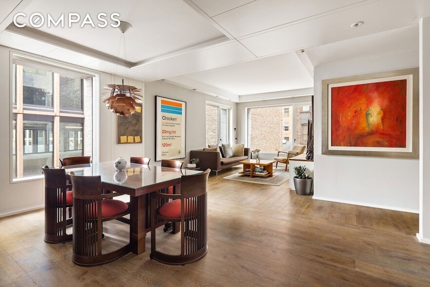 This 1,228 square foot corner two bedroom, two bathroom residence feels distinctly downtown. With north and west exposures overlooking the Meatpacking District, the home blends architectural precision with a refined, artistic sensibility. The living and dining area reads like a private gallery, wrapped in custom milled paneling and sculptural soffit lighting that casts a warm, layered glow. Wide plank Austrian Oak floors and bronze clad windows ground the space in texture and tone. The kitchen is sharply tailored, crafted in custom oak millwork with bronze detailing and honed Absolute Black granite, anchored by a statement island with wine refrigeration below. Integrated Sub Zero, Wolf, and Bosch appliances sit seamlessly within the design. A very large pantry is perfect for gathering all the amazing markets that are nearby The primary suite is quiet and generous, offering two custom closets and a five fixture bath wrapped in Spanish Travertine, complete with a glass enclosed wet room, soaking tub, and solid brass vanity. The second bath introduces handcrafted Moroccan tile and a deep Duravit soaking tub, adding depth and character. A separate laundry room with Miele washer and dryer keeps the home effortless and organized. Fully integrated smart lighting and Sonos audio enhance the experience, while a private storage unit completes the offering. Residents enjoy 24 hour doorman service, a fitness center, and a landscaped roof deck with sweeping views of the Hudson River and Downtown Manhattan, all set in one of the most dynamic neighborhoods in New York City.
