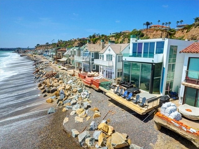 The ultimate in beach living, this modern luxury home boasts the ocean as your backyard! Coveted gate-guarded Beach Rd home was designed by architectural firm headed by John Lehrer and encompasses approx 4800 sq ft with eye catching massive ocean views spanning from DP Harbor to San Clemente to Catalina. Masterfully designed 16' ceilings allows light to pour in through the full glass windows and sliding glass doors encompassing the entire back of the home. Open floor plan for the optimal entertainment space. Dramatic black fireplace is eye catching and centered in the large family room. Dining room is open to the main living area featuring a custom glass temperature-controlled 144 bottle wine cooler. The kitchen is exquisite with the most beautifully underlit onyx island with seating for 8. State of the art stainless-steel appliances, bright white cabinets with glass and black mental uppers and plenty of storage make this kitchen a chef's dream. A total of six bedrooms and six bathrooms, many with peeks of the ocean in brilliantly placed angles, you will find one bed and two baths on the main floor. Three bedrooms and two baths are located on the second level centered around a second living room perfect for children or multi-generational living. One of the most unique office spaces you will ever see is beautifully designed to take full advantage of the sweeping ocean views as well as a work of art with a 20' glass built-in desk open to the living space below. Primary bedroom and bath are located on the entire third floor with 180-degree ocean views with deck perfect for lounging and falling asleep to the sound of the ocean and is positioned at one of the highest points on Beach Road. Fireplace for cozy evenings and built-ins to maximize space. Luxurious bathroom with wet room; shower and jetted tub of course with ocean views! Walk-in closet has approximately 250 sqft of custom built-in storage and a breakfast bar for convenience. Home gym is joined by a private room for massages, yoga, Pilates or sixth bedroom competing the top floor. Limestone flooring on the main floor flows out to the exterior entertaining space equipped with a hot tub and direct access to the sand.