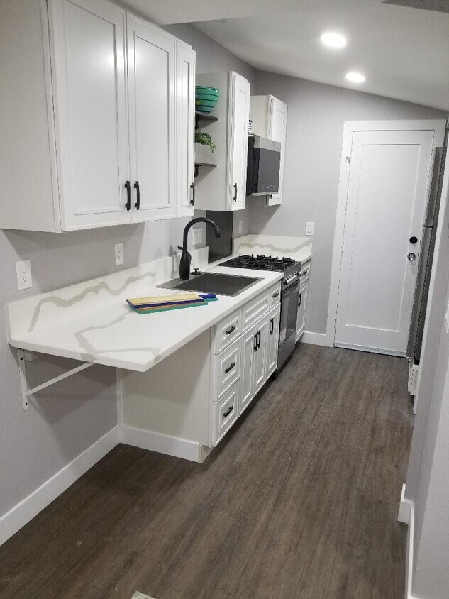 Recently remodeled fully furnished studio apartment with a full-size sofa bed. Full kitchen with stove, oven, microwave and fridge. Built-in desk/dining table for 2. Interior on-site laundry is shared with one other unit, and attached to both. Smart deadbolt and thermostat for heater/ac unit. Utilities including internet (gas, electricity, sewer, trash, water) are included.
