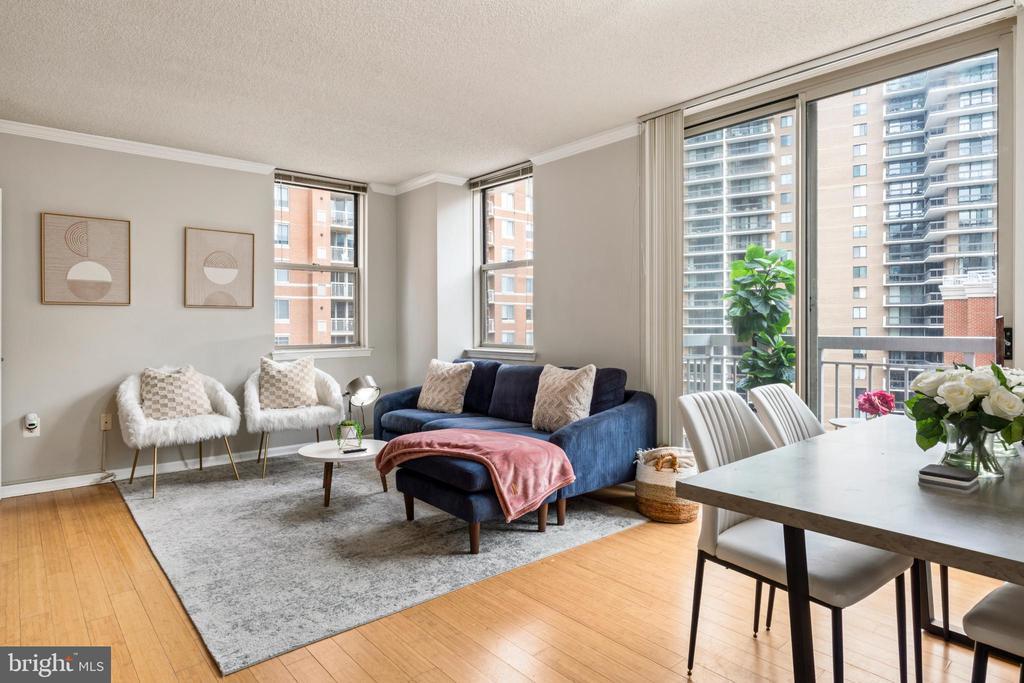 Fully furnished and move-in ready—just bring your suitcases! This beautifully updated 2BR/2BA, w/2 parking spots corner unit includes all furniture, kitchenware, dinnerware, linens, and towels. A 6-month minimum lease is welcome. Enjoy abundant natural light, no neighbors to the right or above the living room, and a private balcony overlooking the pool. The updated kitchen features quartz countertops, a breakfast bar, and a gas stove. Bamboo hardwood floors grace the living, dining, and hall areas, with brand-new carpet in both bedrooms. The spacious primary suite offers a walk-in closet and a spa-like bath with jacuzzi tub and separate frameless glass shower. Additional highlights include two parking spaces, an extra storage unit, a fitness center, and an unbeatable location w/ 2 Metro stations and Ballston Quarter, Ballston Exchange all in walking distance. Minutes from 66 and tons of restaurants and shops.