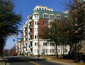 Jefferson Square is a six-story condominium building completed in 2002, located in the heart of Charlotte's historic Fourth Ward. With 144 units, this building combines modern convenience with the charm of a neighborhood known for its tree-lined streets and historic architecture. The building's exterior features a blend of brickwork and stucco, complemented by a mansard roof and dormer windows, adding a touch of classic elegance to its contemporary design. Its curved corner facade with balconies offers residents a unique architectural feature that enhances the living experience.