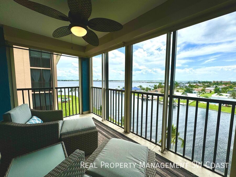 Nestled along the scenic Caloosahatchee River, this top-floor residence offers breathtaking panoramic water views from every angle. Start your mornings with coffee or unwind in the evenings with a glass of wine on the expansive wraparound balcony, where tranquil waterfront scenery and vibrant sunsets create the perfect backdrop. Inside, the open and sun-filled living area is thoughtfully furnished with tasteful décor and quality finishes throughout. The fully equipped kitchen features modern appliances, sleek cabinetry, and a convenient breakfast bar ideal for casual dining. The primary bedroom provides a comfortable retreat with a king-size bed, an en-suite bathroom, and direct access to the balcony. The second bedroom is equally inviting and well-suited for guests or a home office. Residents enjoy access to desirable resort-style amenities, including a waterfront pool, private dock, clubhouse, and covered parking. Ideally located just minutes from downtown Cape Coral, this condo is close to restaurants, shopping, entertainment, and Southwest Florida’s beautiful beaches. Available as a seasonal rental at $2,500 per month or as an annual rental at $1,500 per month. Club House Community Pool Private Dock