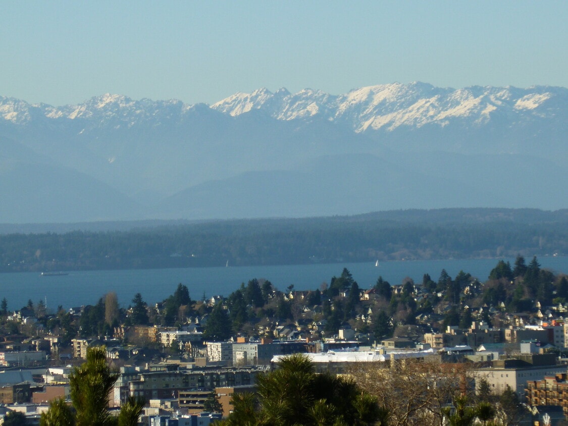 Top Floor condominium in well maintained seven unit building with sweeping 180-degree view of the ship canal and Olympics. Spacious 2 bedroom plus 1 and 3/4 bath, approx 1100 square feet. 1 car garage plus uncovered parking space. Newly painted, sharp unit with deck for barbecuing, wood burning fireplace, wet bar and all appliances including full size washer/dryer. $2600 per month. $1500 deposit. No Pets or smokers Rent includes water/sewer/garbage