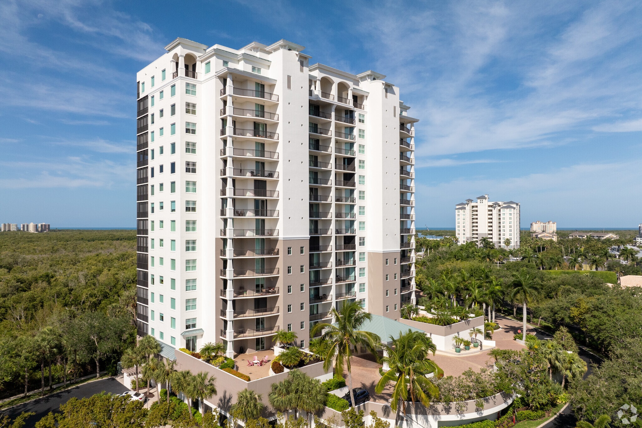 Nevis at Cove Towers stands as a prominent fixture in Naples' luxury real estate landscape. Completed in 2002, this 18-story high-rise condominium offers 67 upscale residences with sweeping views of the Gulf of Mexico, Naples Bay, and the surrounding tropical landscape. The building's sleek design, featuring a neutral color palette and balconies on each floor, complements its coveted location near Wiggins Pass. Nevis combines modern amenities with the natural beauty of Southwest Florida, providing residents with a sophisticated coastal lifestyle.