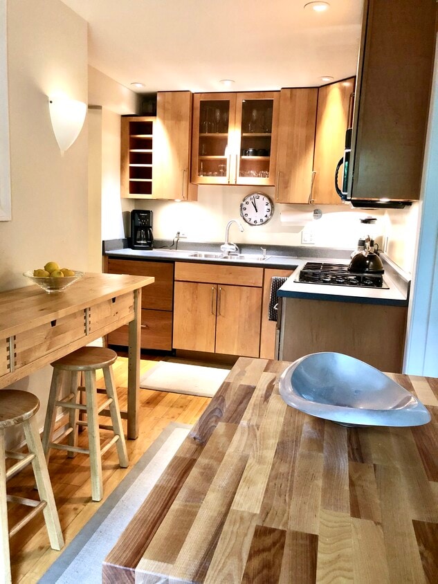 Furnished Studio apartment on the garden level with direct access to The courtyard. Kitchen, features, Solid, maple cabinets,dishwasher, microwave, convection, oven, refrigerator, icemaker. The main living area can go from stylish living room to bedroom in seconds.All leather furnishings are on casters so they can be rolled against the walls and an European wall bed can be lowered.