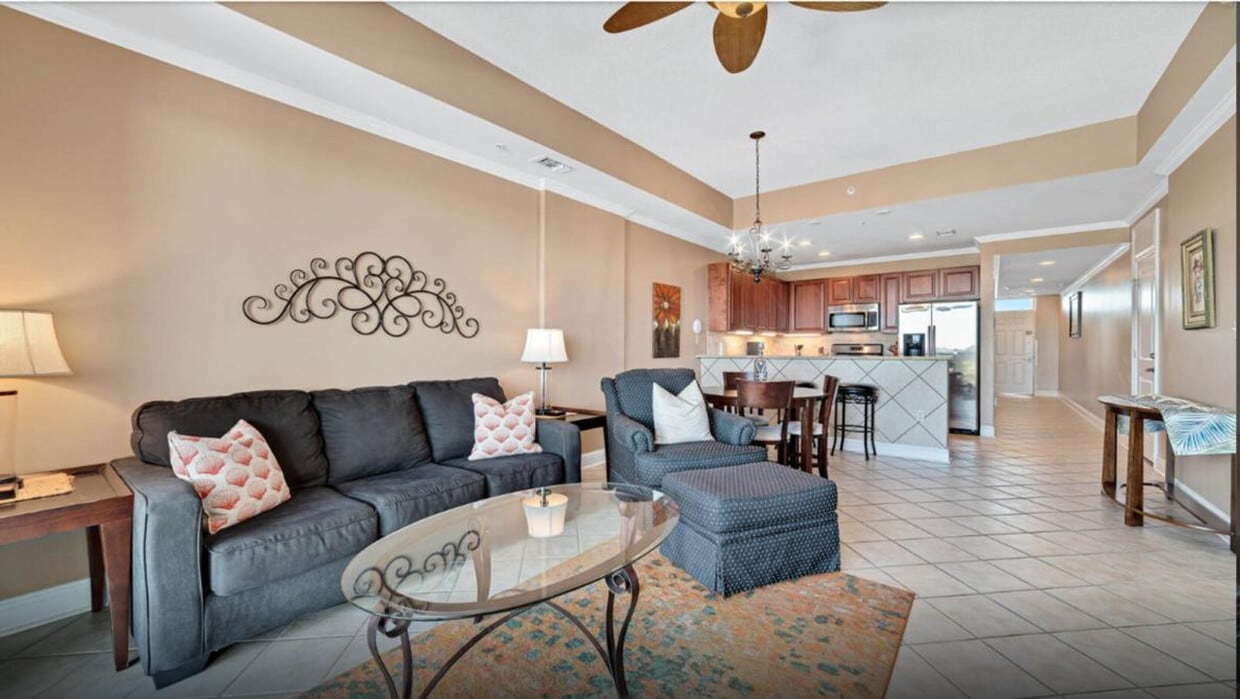 Feel right at home in this 2-bedroom, 2-bath waterfront condo, perched on the 7th floor with stunning views of The Wharf Marina in Orange Beach, Alabama. Elegantly decorated and thoughtfully designed, this retreat comfortably sleeps up to 6 guests and is just minutes from the Gulf of Mexico’s sugar-white sands. This condo features air conditioning, a full kitchen, cable TV, and Wi-Fi. Enjoy the private balcony with a BBQ/grill and outdoor furniture. Guests have access to a shared indoor/outdoor pool, fitness center, shared sauna, and shared hot tub. Parking includes one reserved space on the top level of the parking deck, plus one additional unmarked space. The pool area is nearby and is accessible via a complimentary shuttle. The Wharf offers a lively mix of dining, shopping, and entertainment—all just steps from your door. Local attractions include the Ferris Wheel at The Wharf, AMC Classic Wharf 15, Orange Beach Event Center, Dolphin Cruises, Adventure Island, Gulf State Park, Hugh S. Branyon Backcountry Trail, Cotton Bayou Beach Access, and Orange Beach Waterfront Park. For same day late check-ins, you need to get approval before booking. Smoking is not allowed in the unit or on the balcony, and any violation of the smoking policy will incur a $250 fine plus the cleaning costs necessary to remove smoke odors. Quiet hours are observed from 10 pm-8 am, and violators will be charged a $200 fine. The condominium association has a strict "No Pets" policy, which applies to emotional support animals as they are not covered by ADA. Only ADA compliant service dogs are allowed according to Federal Law. No parties or events are allowed, and violators will be charged a $500 fine. For March 1st to May 1st the minimum age requirement for check-in is 25 years old. A state identification card or driver's license copy will be requested upon booking. Guests must be at least 22 years of age to make a reservation. Your stay comes with access to the incredible Oasis pool area, which includes a long, winding lazy river with rock wall formations and waterfalls, a zero-entry wave pool that simulates ocean waves, a lagoon-style pool and a children’s area with a splash pad and mini slides. Other amenities include a large grotto-style hot tub, hammock island, sandy beach area, and the Oasis Grill & Tiki Bar for food and beverages. There is also a sand volleyball court. [SI]