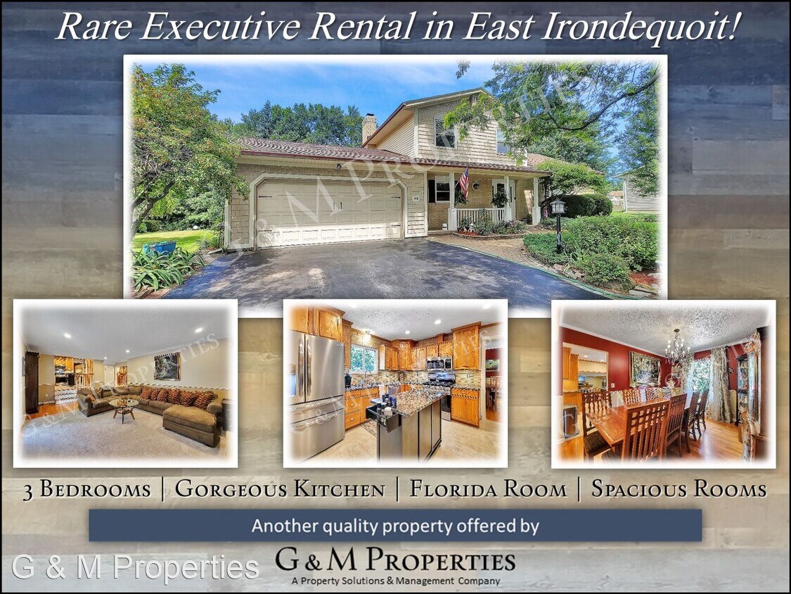 - Totally Remodeled 3-Bd Single-Family Home on Irondequoit Bay - Take a look at this beautiful 3-bedroom home in East Irondequoit, located on a cul-de-sac! Pride of ownership can be found throughout. On the main level, you have a gorgeous kitchen with a ton of cabinet space, granite countertops and stainless steel appliances. Just off of the kitchen, you have a formal dining room and large living room. You have a spacious family room that has patio doors that connect to a fantastic enclosed Florida room. Continue upstairs and you’ll find 3 spacious bedrooms and two full bathrooms. Downstairs you’ll find a partially finished basement, including a ton of extra space for all of your storage needs. Here is where you’ll find the laundry room, with a washer and dryer included for your convenience. You have an attached two-car garage, with a long, double-wide driveway. There are many extras found all through this property. You have a dedicated office just off of the garage, gleaming hardwood floors throughout, a large back deck connected to the Florida room, and a huge backyard. Located in East Irondequiot, you simply can't beat the location. Quick access to 590 makes for an easy commute to just about anywhere. Just minutes to shopping, restaurants, schools and parks. Just minutes to RGH and Strong Hospital! Definitely call today to schedule your walk-through of this fantastic home! Another fine property that is professionally managed by G&M Properties. You'll love living in this fantastic single-family home, with all the conveniences this area has to offer, combined with the great benefits that include 24-hour, 1-call maintenance and online rent payment. G&M Properties | | Monthly Rent starting at $2,395. Please call for details. ------------------------------------------------- **NO Smoking** **Credit Check / Background Check Required* No Pets Allowed (RLNE7614033) Other Amenities: Other (close to rgh, 10 miles to strong hospital, located on cul-de-sac, enclosed back porch, 3-season back porch, 3-bedrooms, 2.5 baths, hardwood floors, 1st floor office, new kitchen, remodeled bathroom, master bathroom, fireplace, professionally landscaped, online rent payment, 24/7 maintenance, professionally managed by g&m properties, 5-star rated landlord, washer & dryer in basement), Garage, Patio. Appliances: Dishwasher, Air Conditioning, Refrigerator, Range. Utilities: Water Included. Pet policies: No Dogs Allowed, No Cats Allowed.
