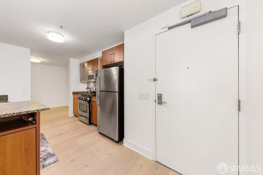 Enjoy the parks of city living from the quiet community of The Lansing. This spacious 1BR home has two entrances, a front patio, new hard wood floors throughout, and a bonus room that is perfect for a home office. The kitchen features cherry Studio Becker cabinetry, stainless steel appliances, granite countertops, and more. In-unit washer/dryer, A/C, and unit comes with one XL storage cage and 1 parking spot. The Lansing is a boutique condo building nestled on a quiet street in the heart of South Beach. The Lansing is a pleasant walk to downtown, the Embarcadero waterfront and the Financial District. Easy access to the Bay Bridge, 101, 280 and public transportation. The building has a fully functional fitness center and a roof deck with BBQ grill that's perfect for entertaining with panoramic city and water views. **Available for move in on May 1st.** MLS # 426116702